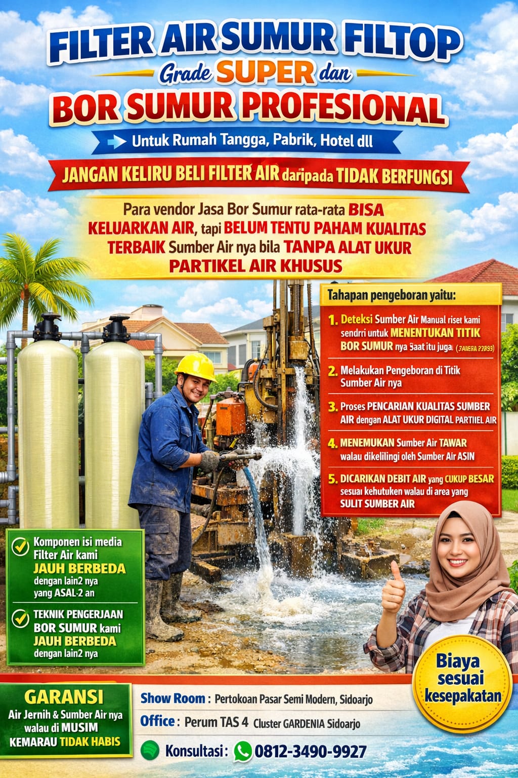 Untuk Filter Air Sumur + Bor Sumur Melayani : Rumah Tangga, Kos, Laundry, Cuci Mobil, Salon, RS, Hotel, Pabrik dll